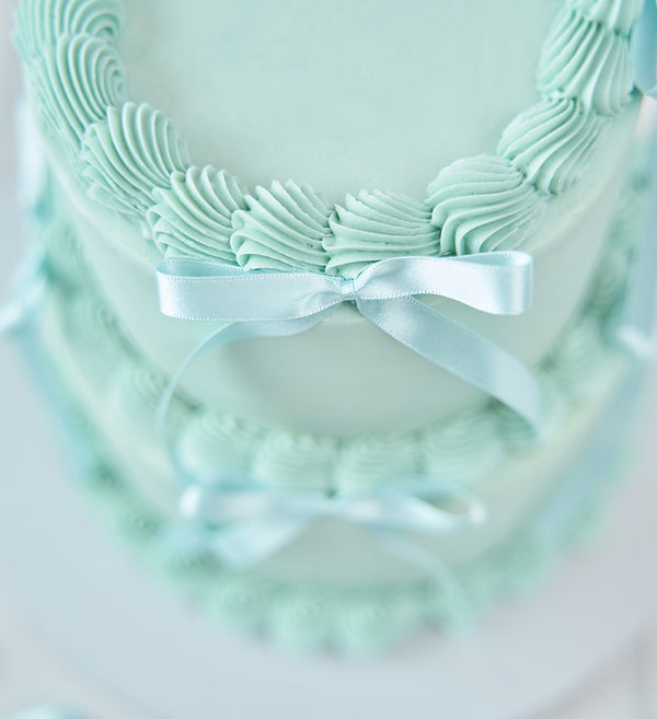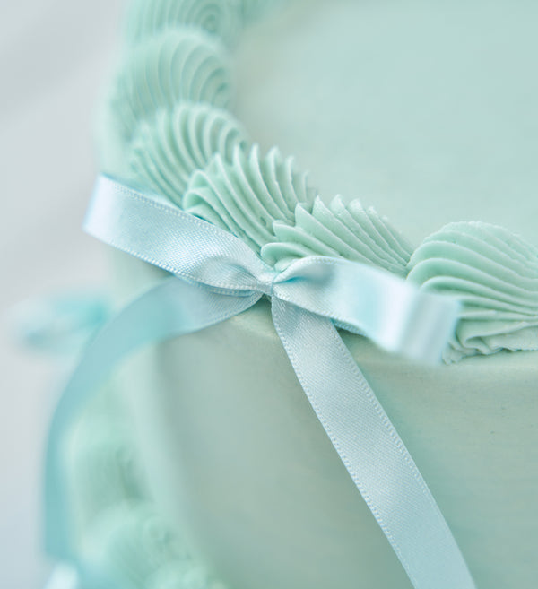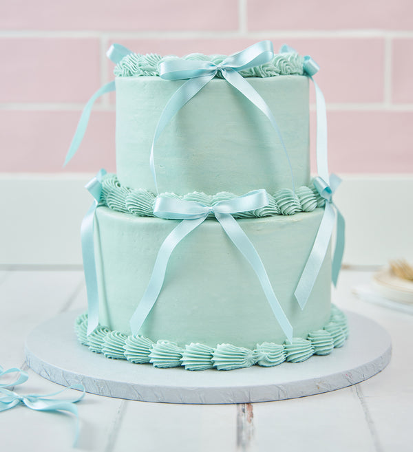 Treat yourself to a slice of simple vintage charm! Decorated with blue vanilla icing and optional matching bows, it’s a nostalgic delight in every bite.