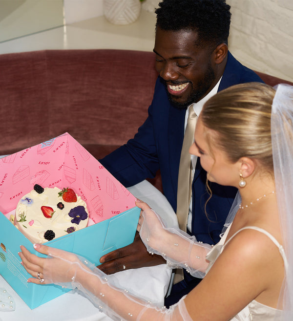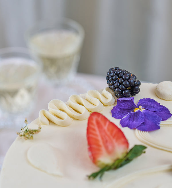 Embrace the abstract with this simply stunning chaos cake. Decorated with white vanilla buttercream, playful swirls of buttercream, an assortment of fresh fruit and delicate edible flowers.