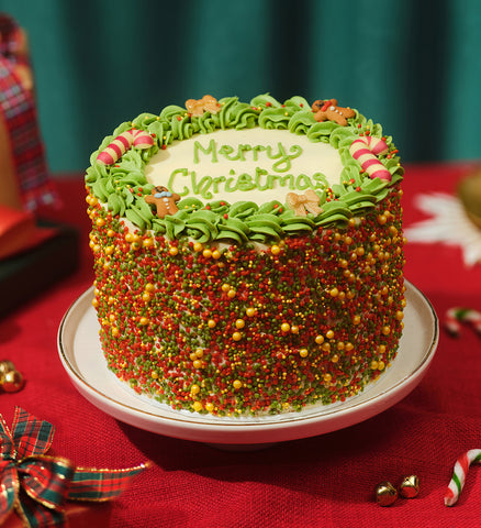 Turn up the Christmas glamour with this red vintage-inspired beauty! Choose your favourite sponge - vanilla, chocolate, red velvet, or gingerbread - finished with elegant green and white piped buttercream swirls.