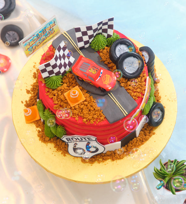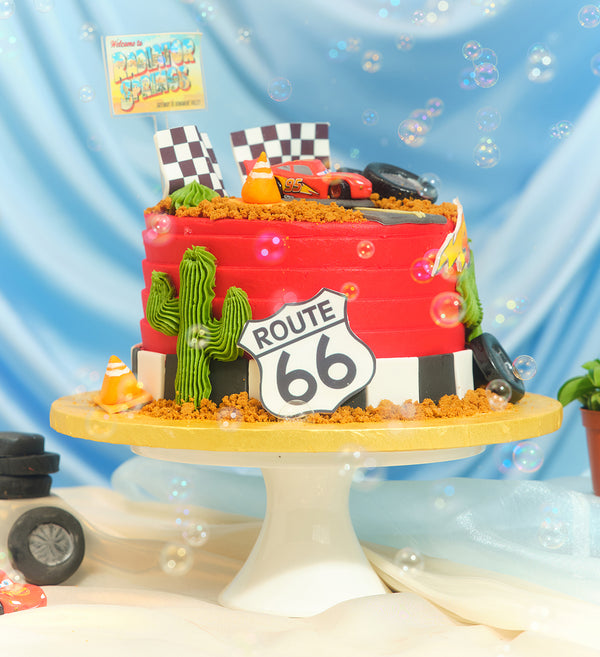 Start your engines and indulge in a high-speed treat with our Disney and Pixar Cars inspired cake! Decorated with smooth red vanilla buttercream and piped green cacti. Topped with sugar paste tyres, chequered race flags, Radiator Springs sign and finished with a toy Lightning McQueen