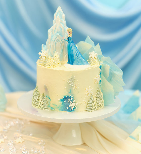 Embrace the icy magic with our Disney Frozen inspired cake. This is a true celebration showstopper, topped with an intricate white chocolate castle, piped buttercream trees, white chocolate shards and snowflakes. Finished perfectly with an Elsa toy.