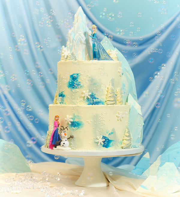 Embrace the icy magic with our Disney Frozen inspired cake. This is a true celebration showstopper, topped with an intricate white chocolate castle, piped buttercream trees, white chocolate shards and snowflakes. Finished perfectly with Elsa, Anna & Olaf toys.