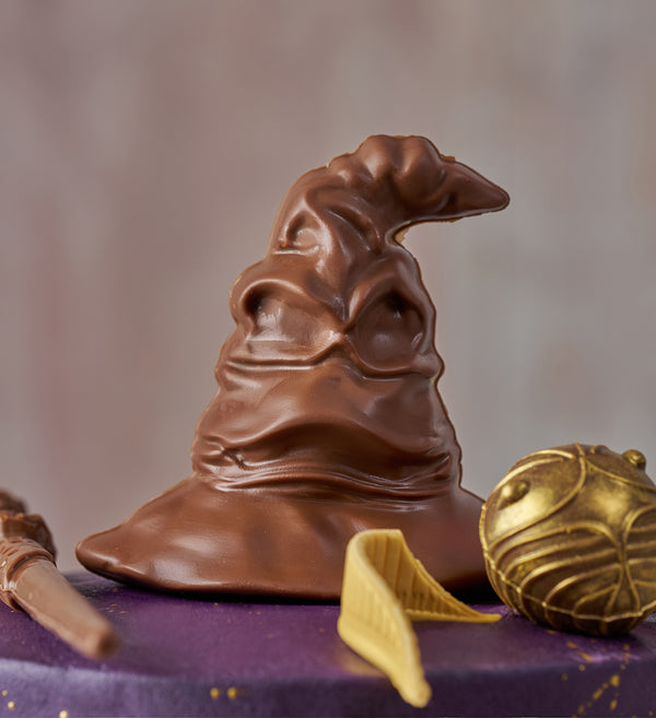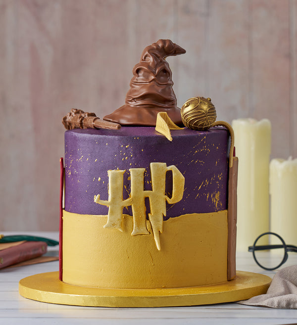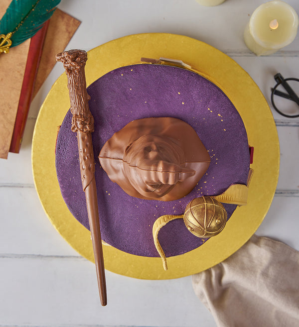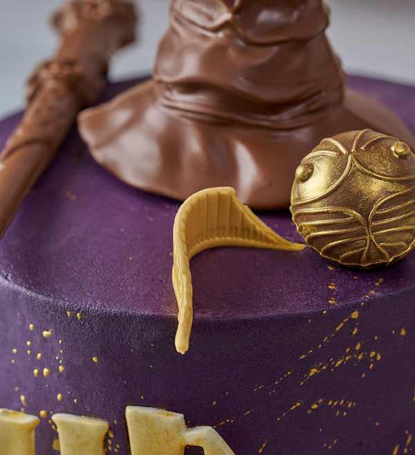 Our talented bakers have conjured up the ultimate centrepiece to any Harry Potter inspired celebration! Finished with a vanilla purple buttercream and decked with an assortment of chocolate decorations including a wand, sorting hat and golden snitch.
