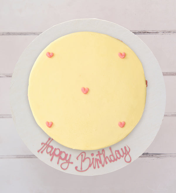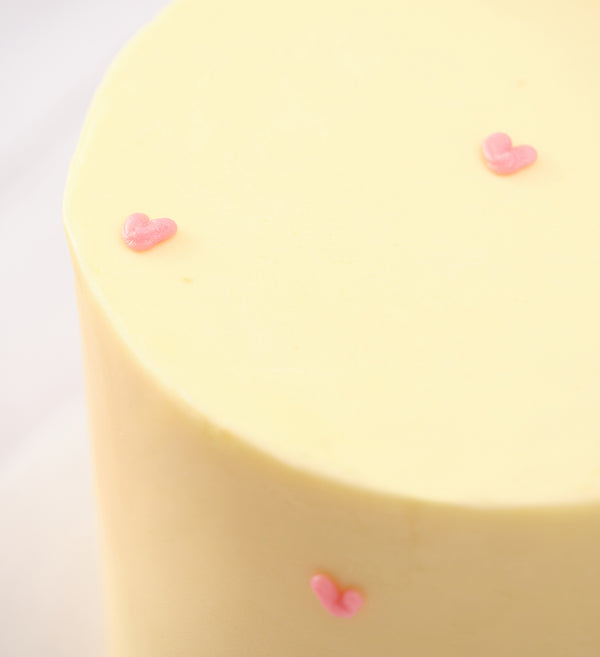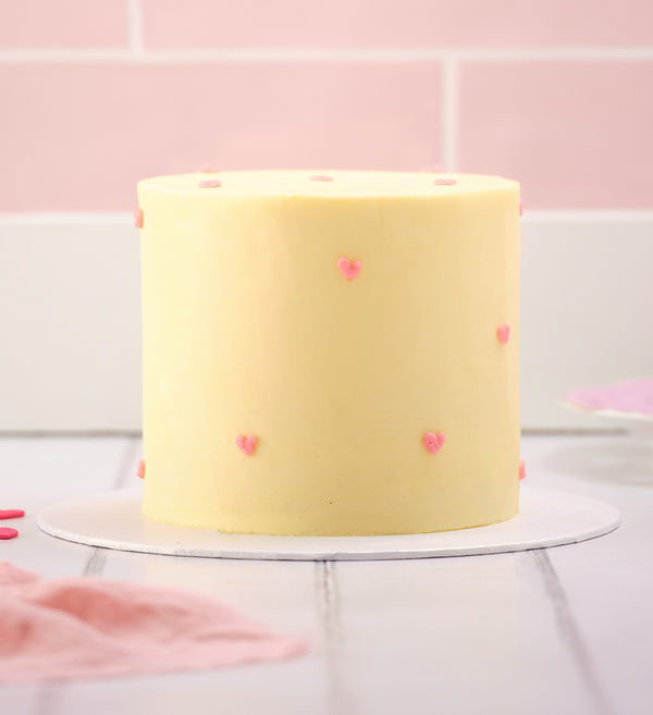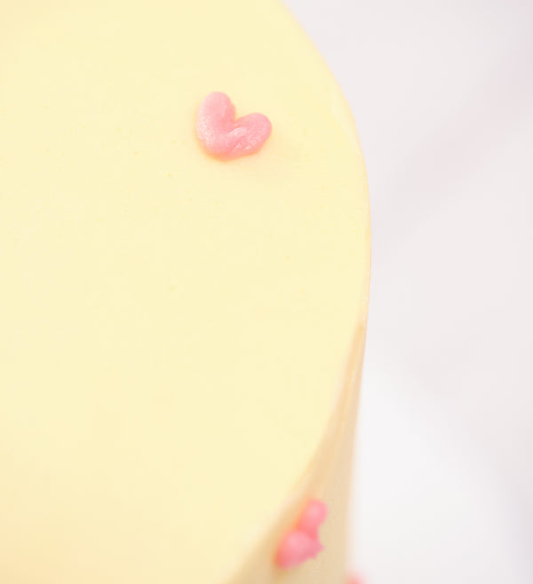 Simple, and oh-so-cute! This mini (but tall!) cake is decorated with vanilla buttercream and hand-piped with the prettiest soft pink buttercream hearts.