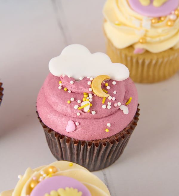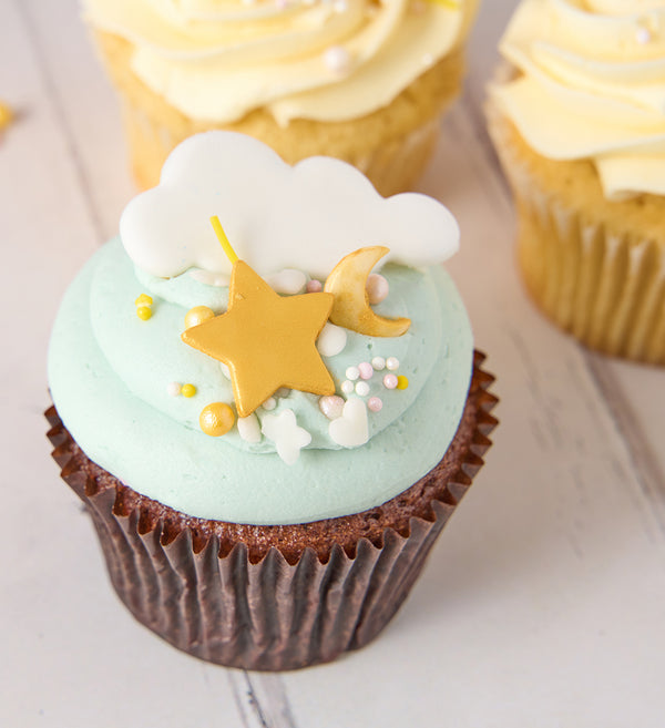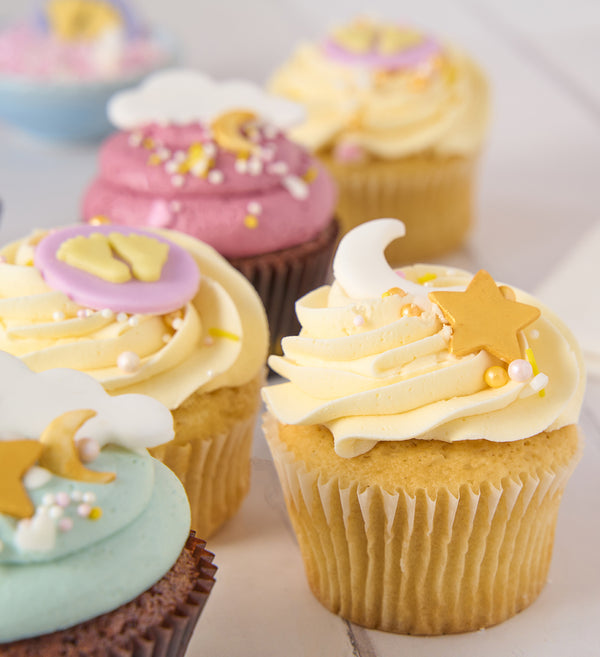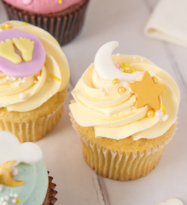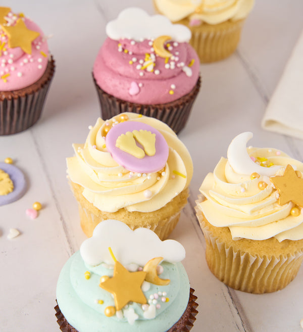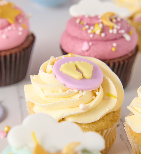 Celebrate a little one on the way with cupcakes! Delicious chocolate and vanilla cupcakes hand decorated with baby blue, pink, purple and white vanilla buttercream as well as cute sugar paste toppings