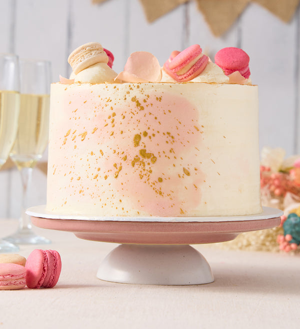A pastel wedding cake of dreams. Freshly baked sponge layers, handpiped with buttercream and speckled with gold flecks. Crowned with macarons and elegant rose petals.
