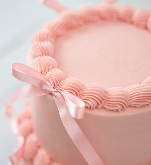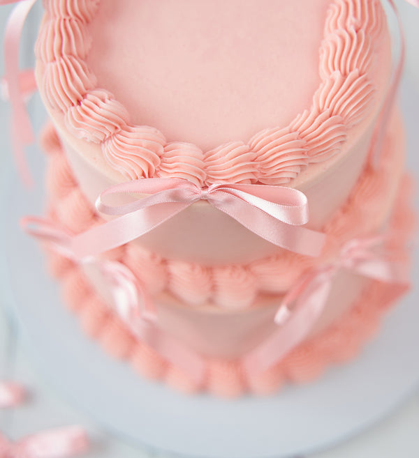 Treat yourself to a slice of simple vintage charm! Decorated with pink vanilla icing and optional matching bows, it’s a nostalgic delight in every bite.