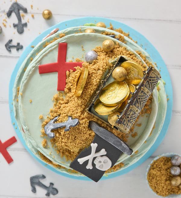 Feast your eyes on this pirate themed creation where you can choose vanilla, chocolate or lemon sponge decorated with blue vanilla buttercream. Finished with an array of sugar paste pirate decorations, Maltesers, gold coins, biscuit crumbs and topped with a toy treasure chest!
