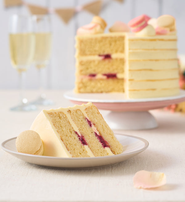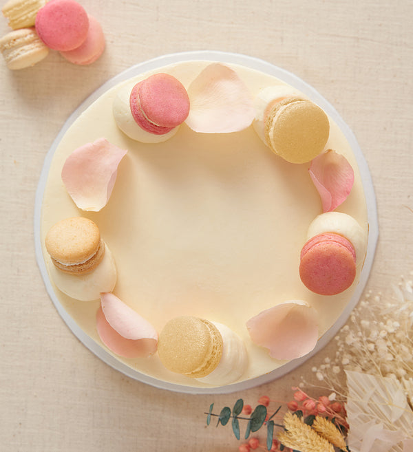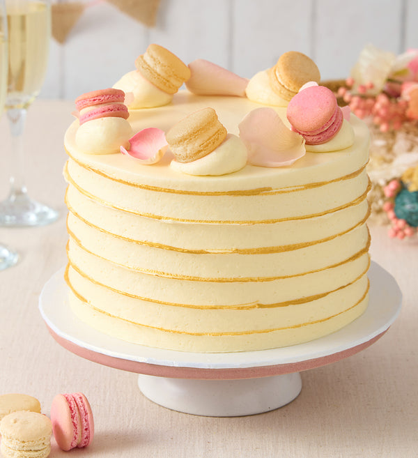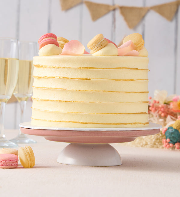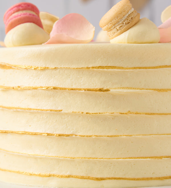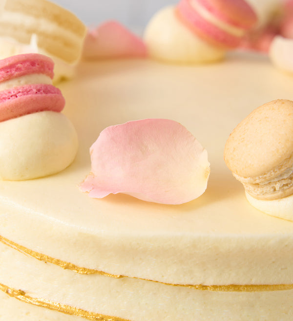 Say 'yes' to a classically beautiful wedding cake. Freshly baked sponge layers paired with ivory vanilla buttercream and hand-painted with gold dust. Crowned with vanilla and rose macarons and delicate rose petals.