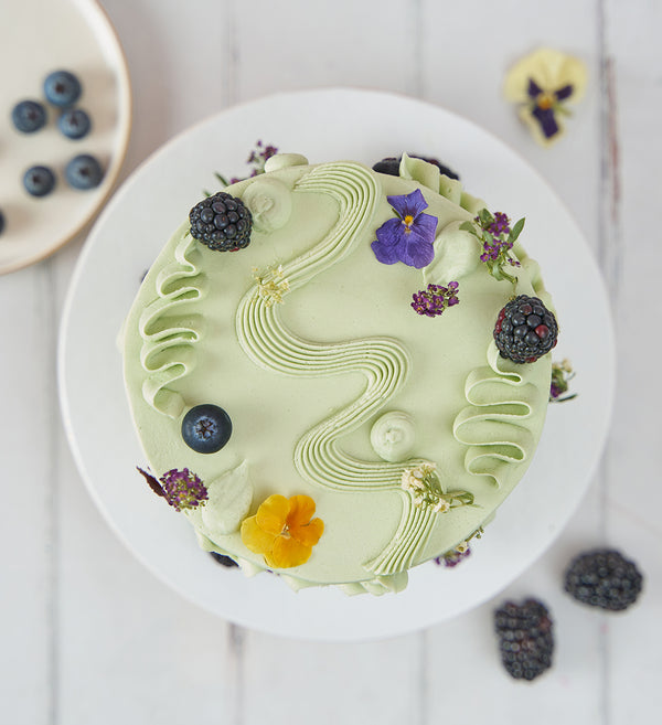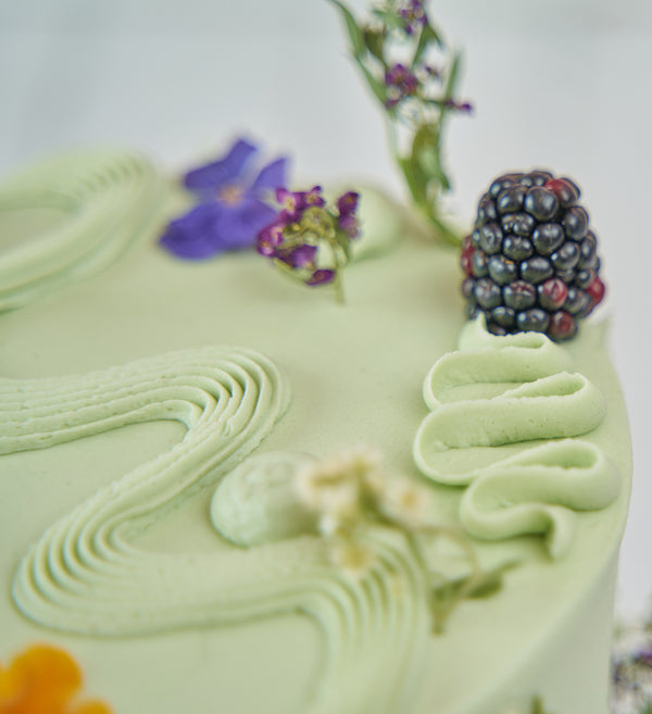 Embrace the abstract with this simply stunning Sage Green 'Chaos Cake'. Decorated with playful swirls of green vanilla buttercream, as well as an assortment of fresh fruit and delicate edible flowers.