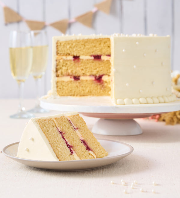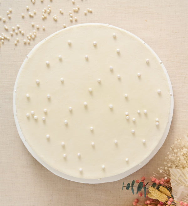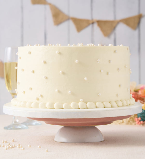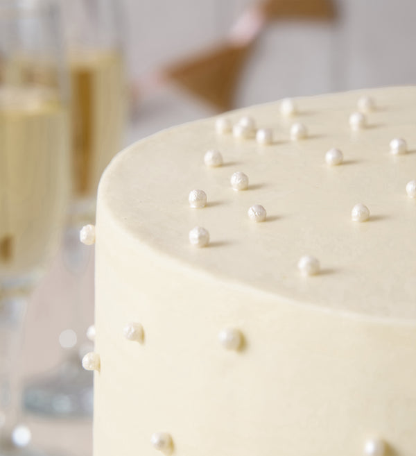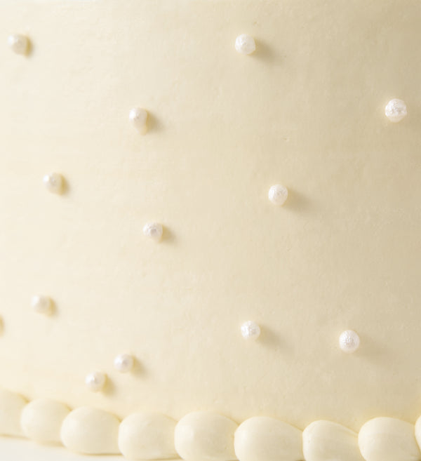 Pearly white delight. Moist sponge layers, hand decorated with vanilla buttercream. Studded with sugar pearls.