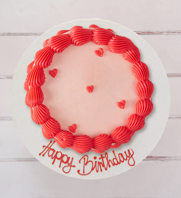 A swoon-worthy centrepiece for your celebration! This elegant mini (but tall!) cake is topped with soft pink vanilla buttercream and finished with red ganache hearts and ruffles.