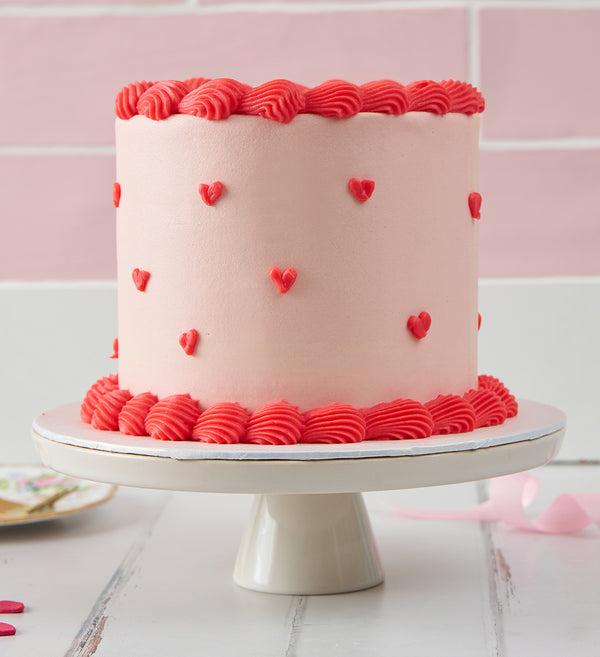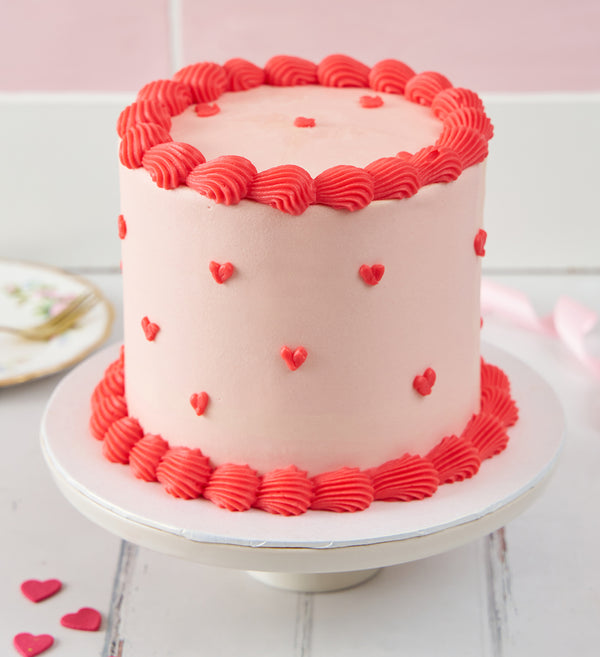 A swoon-worthy centrepiece for your celebration! This elegant mini (but tall!) cake is topped with soft pink vanilla buttercream and finished with red ganache hearts and ruffles. Personalisation message will be piped in red icing.