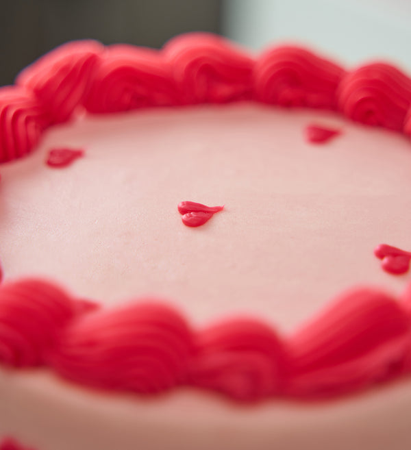 A swoon-worthy centrepiece for your celebration! This elegant mini two tier cake is topped with soft pink vanilla buttercream and finished with red ganache hearts and ruffles.