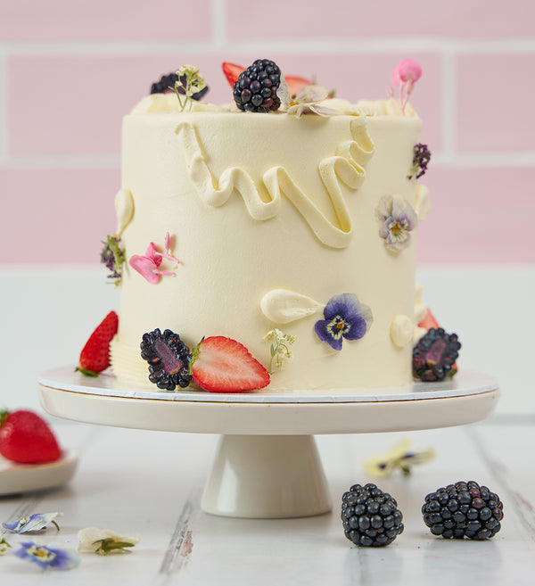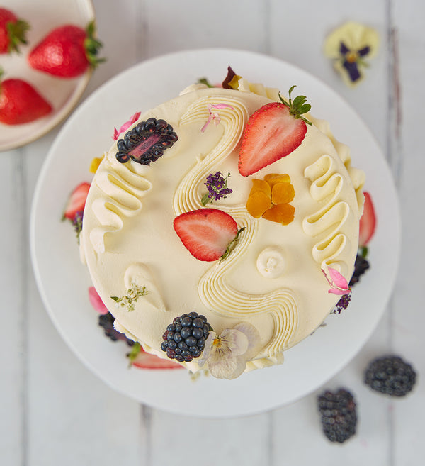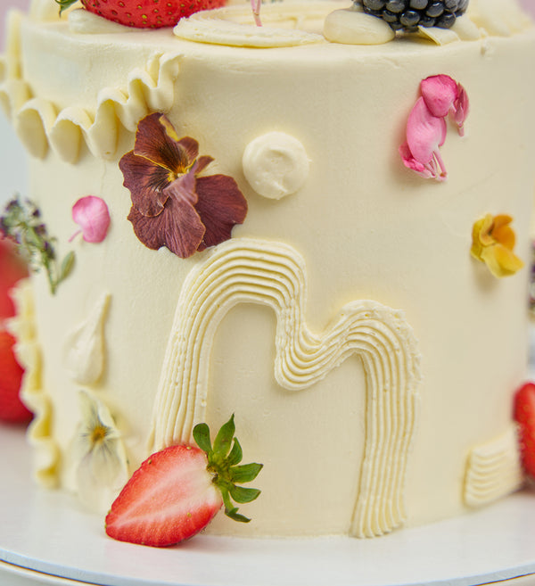 Embrace the abstract with this simply stunning chaos cake. Decorated with white vanilla buttercream, playful swirls of buttercream, an assortment of fresh fruit and delicate edible flowers.